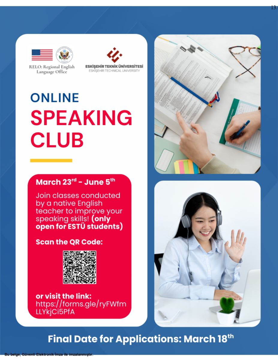 Amerikan Büyükelçiliği iş birliğiyle Online İngilizce Konuşma Programı'na Eskişehir Teknik Üniversitesinde eğitim gören tüm Lisans ve Yüksek Lisans öğrencileri davetlidir. Program 100 (yüz) kişilik kontenjanla sınırlıdır, 18 Mart 2026 Çarşamba günü saat 18:00'e kadar afişteki karekod veya link üzerinden başvuru yapabilirsiniz.