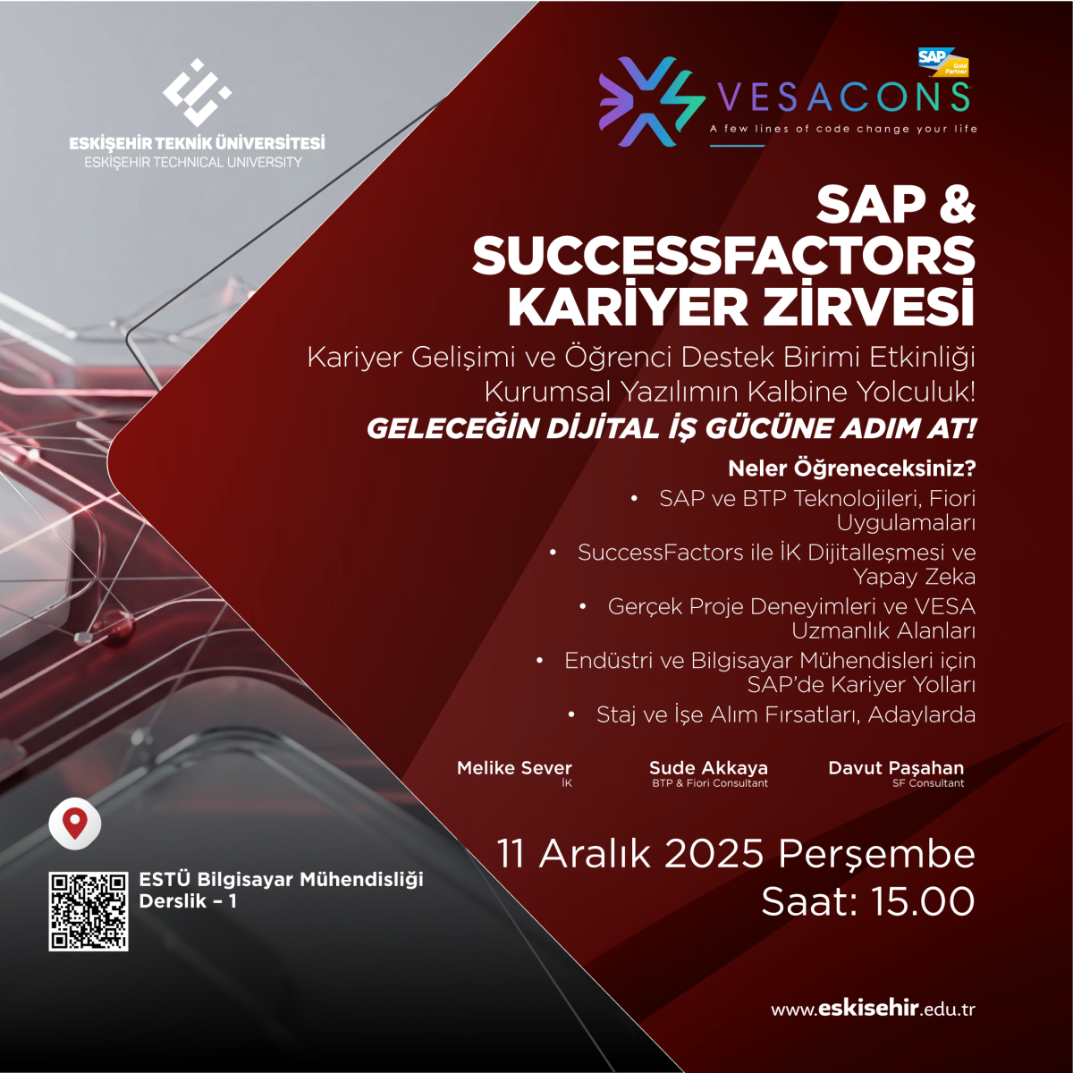 VESACONS - SAP & SUCCESSFACTORS Kariyer Zirvesi Etkinliği 11 Aralık 2025 Perşembe günü saat 15.00'te Bilgisayar Mühendisliği Bölümü Derslik 1 'de gerçekleştirilecektir. Katılımınızı bekleriz.
